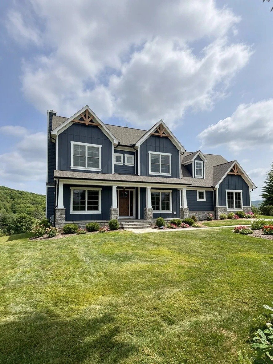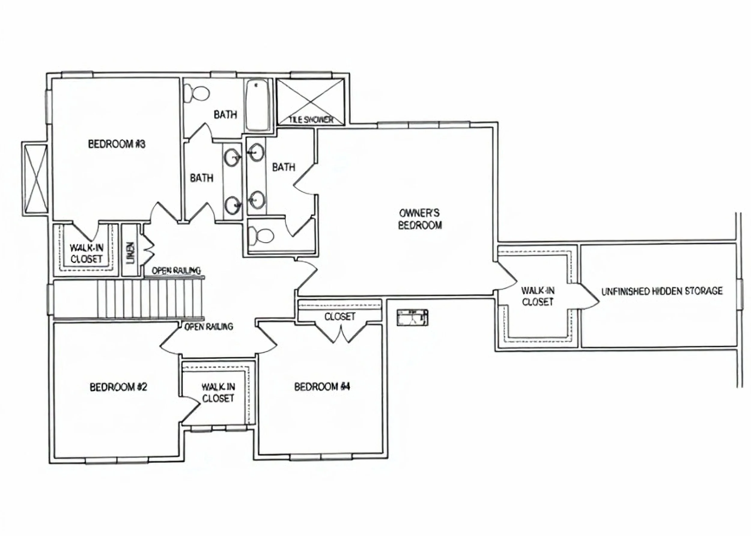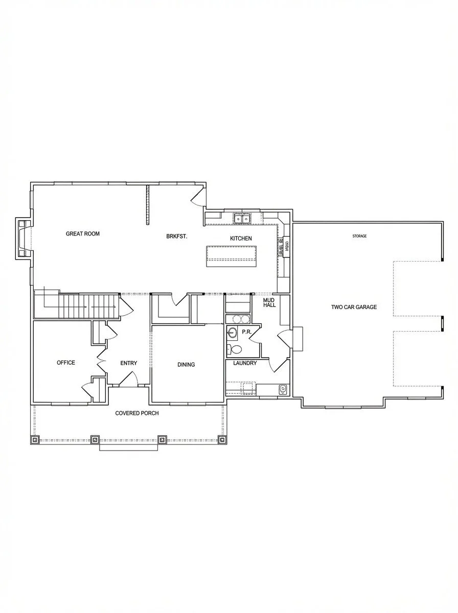 A traditional two story with all the features a larger family needs. The first floor has a rather traditional floor plan with an office and dining room toward the front of the home and a great room kitchen and dining area at the rear. Stairs to the second floor add a transitional tone to the floorplan. All the family bedrooms are upstairs for an efficient layout. The owners suite includes a large closet that can be expanded, or use the additional space as cold storage or even a hidden room.
